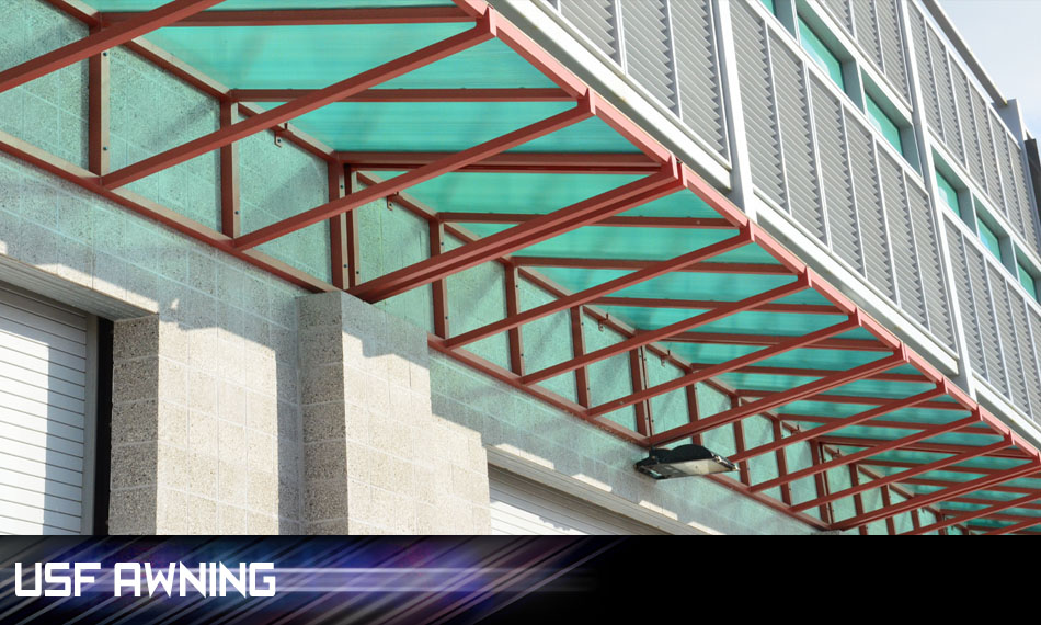 This awning which goes around the Energy Saver Plant next to the USF Sundome was another o8o fabrication. We made the frame out of metal and then powdercoated it red. We then mounted blue-green plastic on top to provide shade for anyone walking along the side of the building.